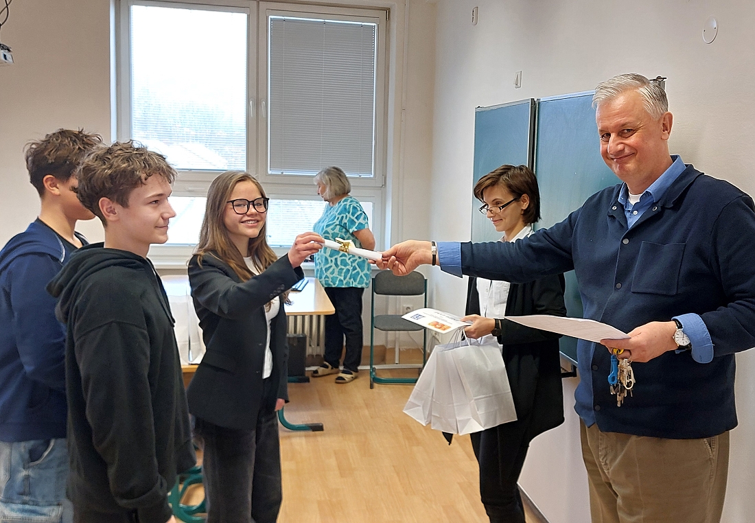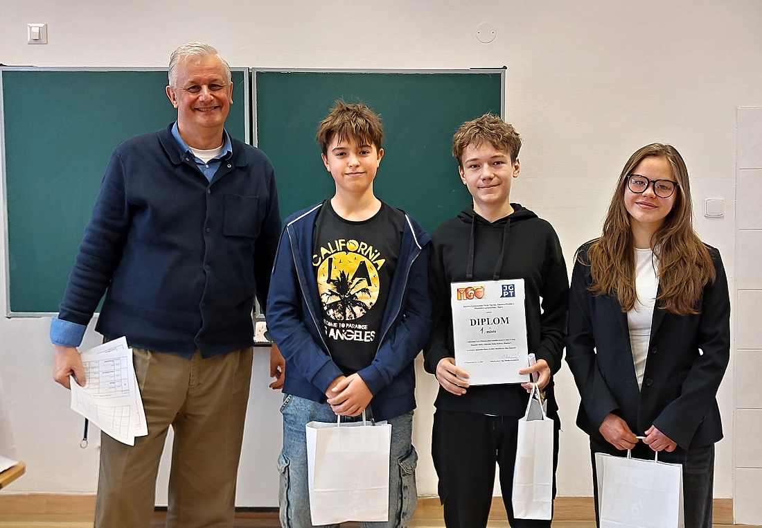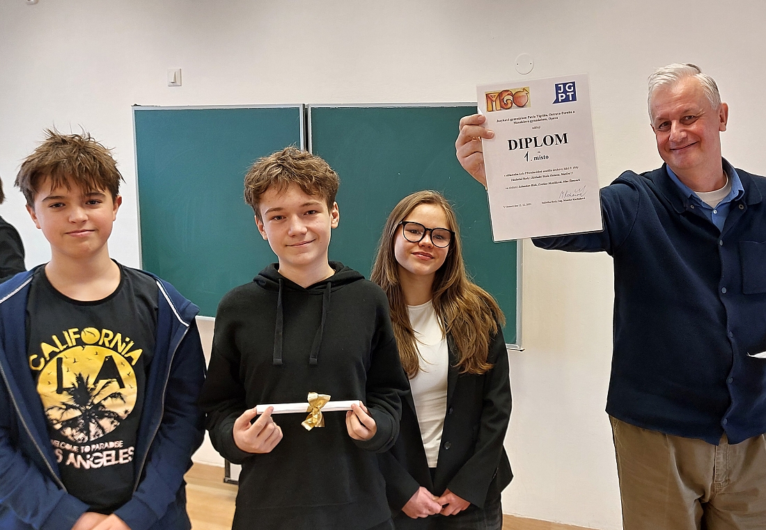 Naše družstvo 9. A ve složení Sebastian Bijok, Evelína Menšíková, Max Šimonek si vedlo výborně a obsadilo skvělé 1. místo a postupuje do krajského kola, které proběhne 27. ledna 2026 na Mendlově gymnáziu v Opavě.