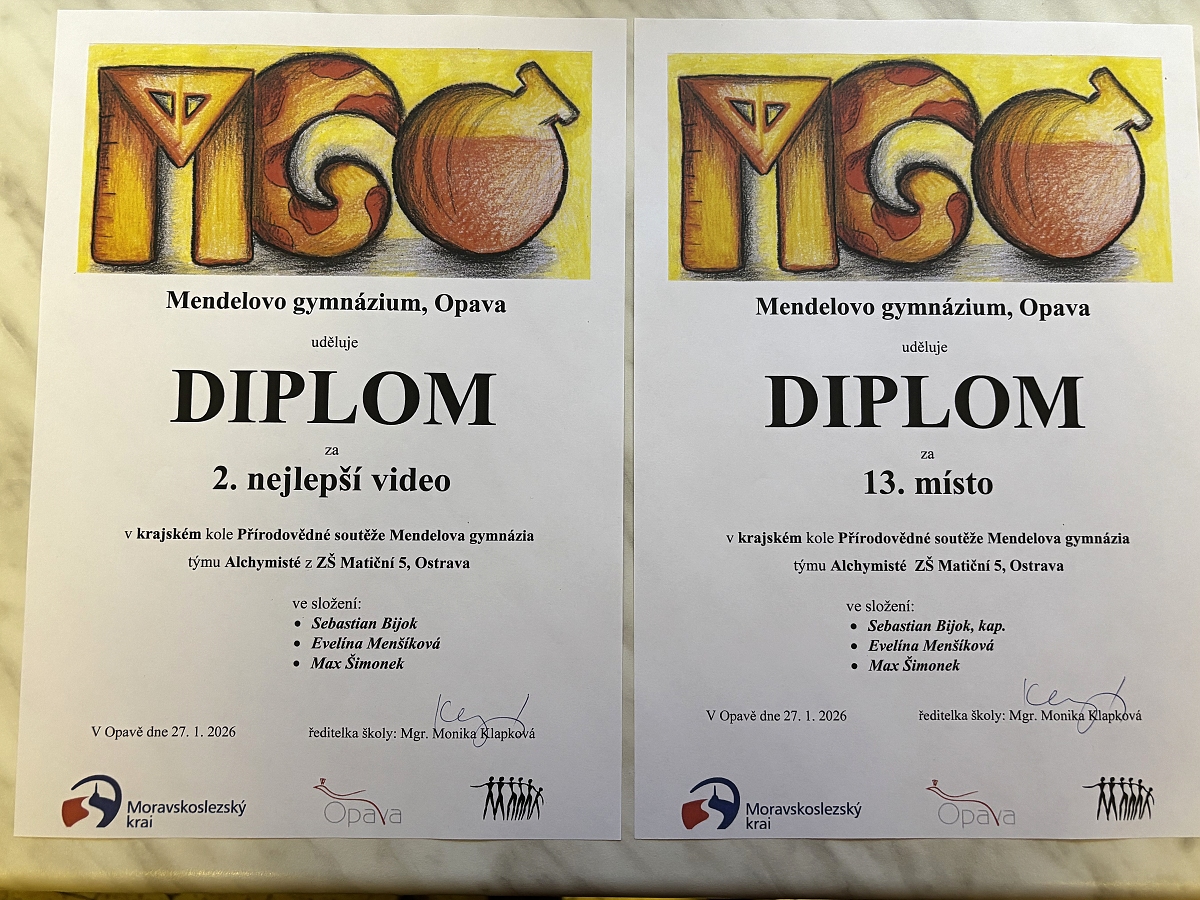 Dne 27. ledna 2026 se na Mendelově gymnáziu v Opavě uskutečnilo krajské kolo 17. ročníku Přírodovědné soutěže a náš tým z 9. A ve složení Sebastian Bijok, Evelína Menšíková a Max Šimonek zde zazářil – jejich video na téma „Poklad na konci duhy“ s názvem „Světlo a stín“ bylo ohodnoceno jako druhé nejlepší v celém Moravskoslezském kraji. Tento skvělý výsledek je důkazem jejich kreativity, originality a schopnosti prezentovat své nápady na velmi vysoké úrovni.