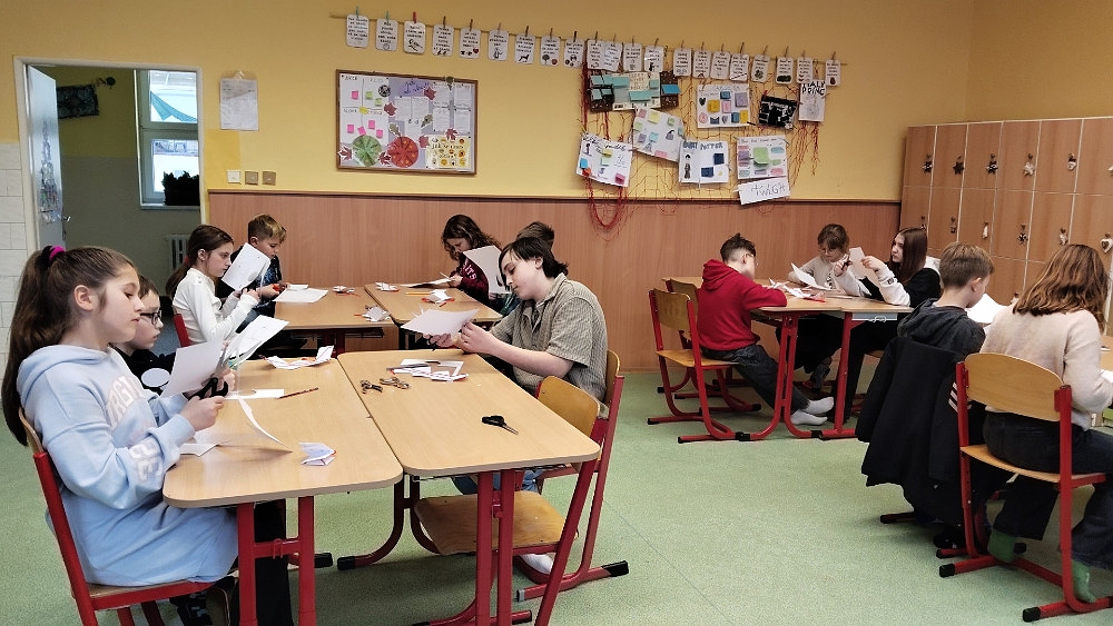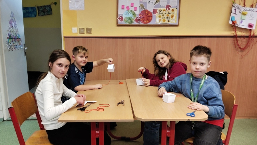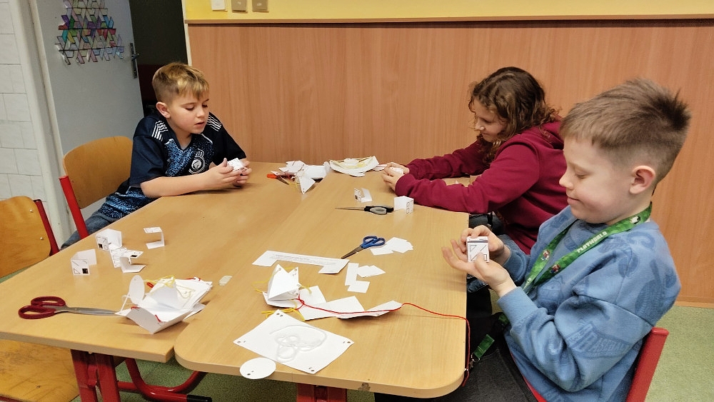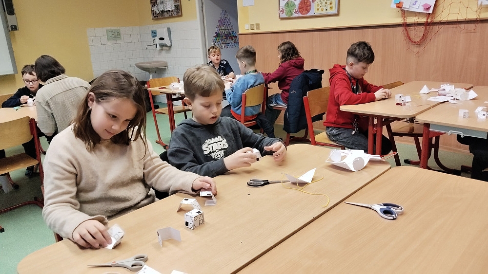 Druhé odpoledne patřilo matematice a neslo název „Hrátky s geometrickými tělesy“. Třináct žáků ve věkově smíšených skupinách se pustilo do hravého a názorného poznávání prostorových tvarů. Pracovali s modely těles, zkoumali jejich vlastnosti, učili se je rozlišovat v běžném okolí a rozvíjet svou prostorovou představivost. Důraz byl kladen na aktivní objevování, manipulaci, jednoduché úkoly, hry a praktické činnosti, které podporovaly logické myšlení i spolupráci při učení. Vše probíhalo přirozenou a zábavnou formou, která posilovala pozitivní vztah žáků k matematice.