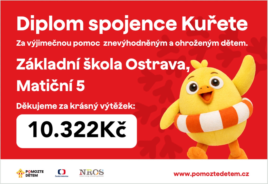 Z vybrané částky máme velkou radost, protože víme, že i zdánlivě malý příspěvek může pomoci tam, kde je to opravdu potřeba.