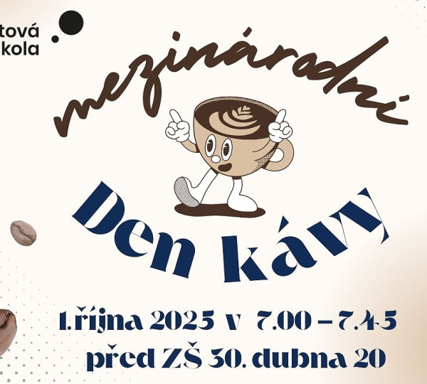 Ve středu 1. října 2025 od 7.00 do 7.45 budeme stát před budovou ZŠ 30. dubna 20, kde nabídneme kolemjdoucím, rodičům i přátelům školy kávu s sebou zdarma, servírovanou do darovaných hrníčků, které jsme společně vysbírali.