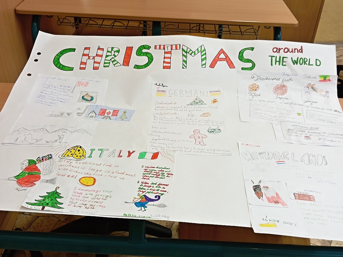V pátek dne 12. 12. měla třída 6. A projektový den s angličtinou na téma „Vánoce po celém světě“. Během 4 vyučovacích hodin s naší rodilou mluvčí, sympatickou Američankou Michelle, se žáci dozvěděli zajímavosti o tom, jak se slaví Vánoce v různých zemích, vypracovali plakát na toto téma a zahráli si vědomostní a zábavné hry.